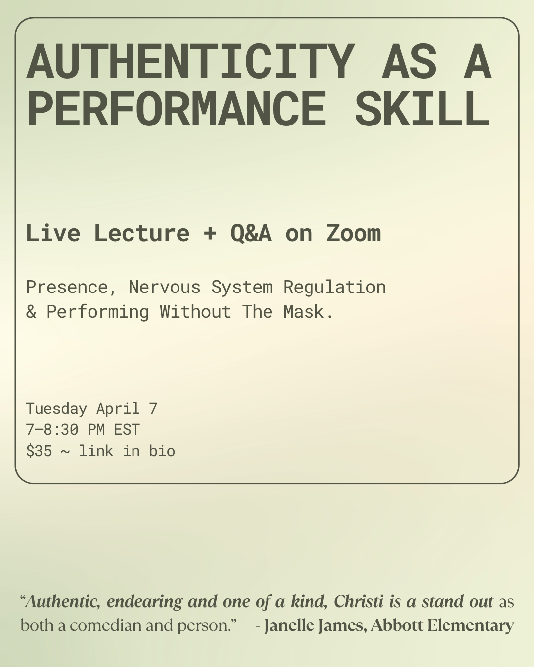 Through personalized sessions, Christi helps clients strengthen their communication skills, refine their point of view, and bring more confidence to their work, onstage or off. Her coaching is ideal for comedians, storytellers, speakers, founders, or anyone looking to communicate with greater clarity, power, and presence.